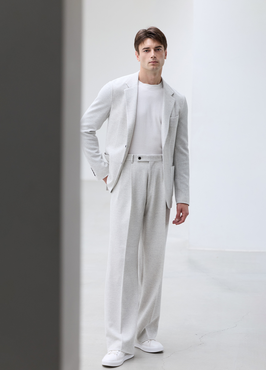このデザインは、リネンやツイードなどの表情のある生地、ジャージー等のストレッチ素材を用いるとき、大人の男性に向けた上質な私服として完成します。